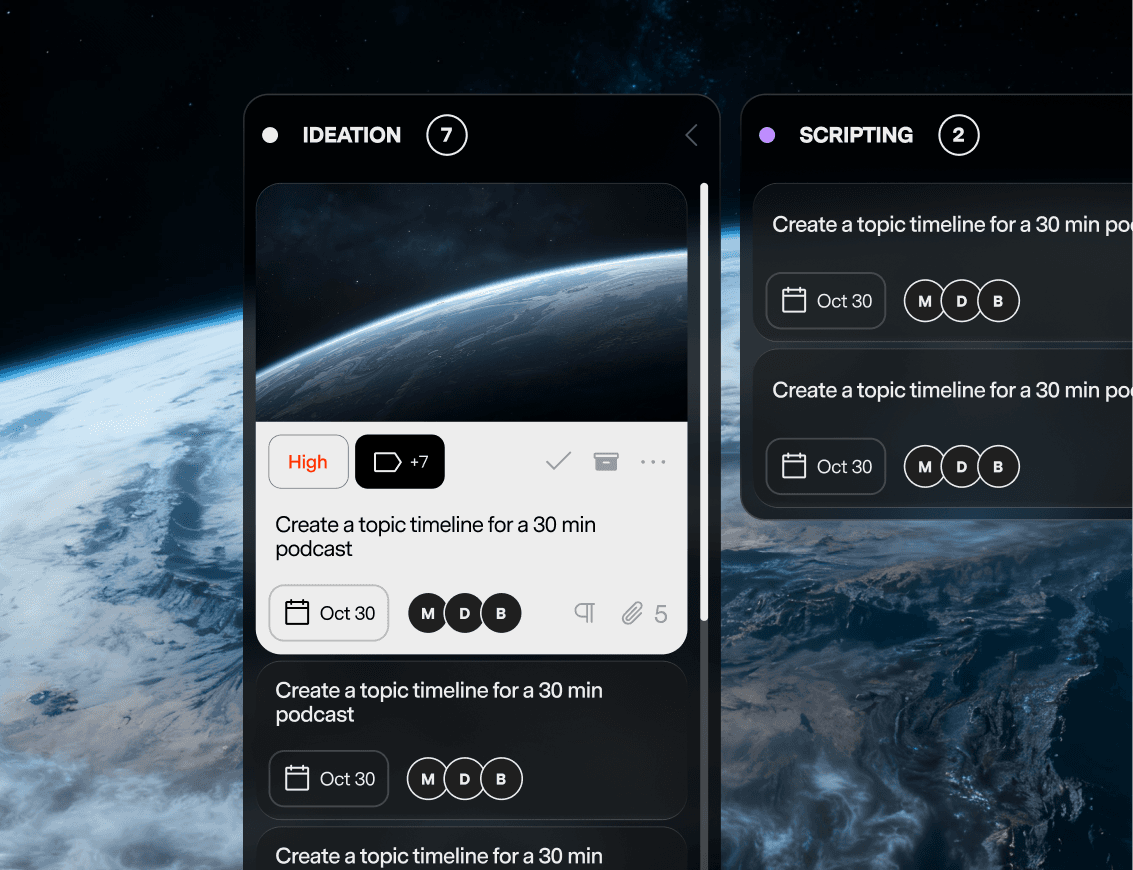 Kanban boards designed for video production. Track every project from ideation through publishing. Your entire pipeline in one visual workflow.